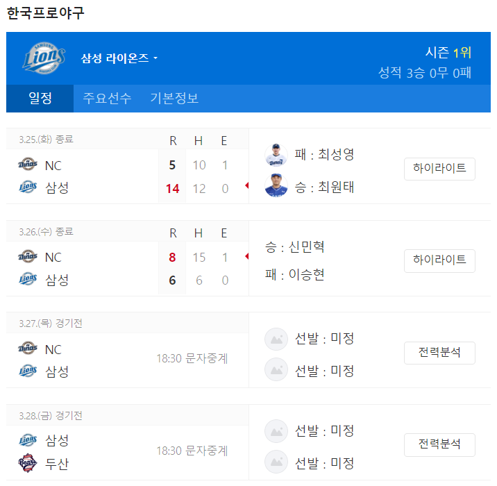 이런 타선 구성이니, 다음 삼성라이온즈 경기일정에서도 화끈한 타격전을 기대해볼 수밖에 없겠죠.